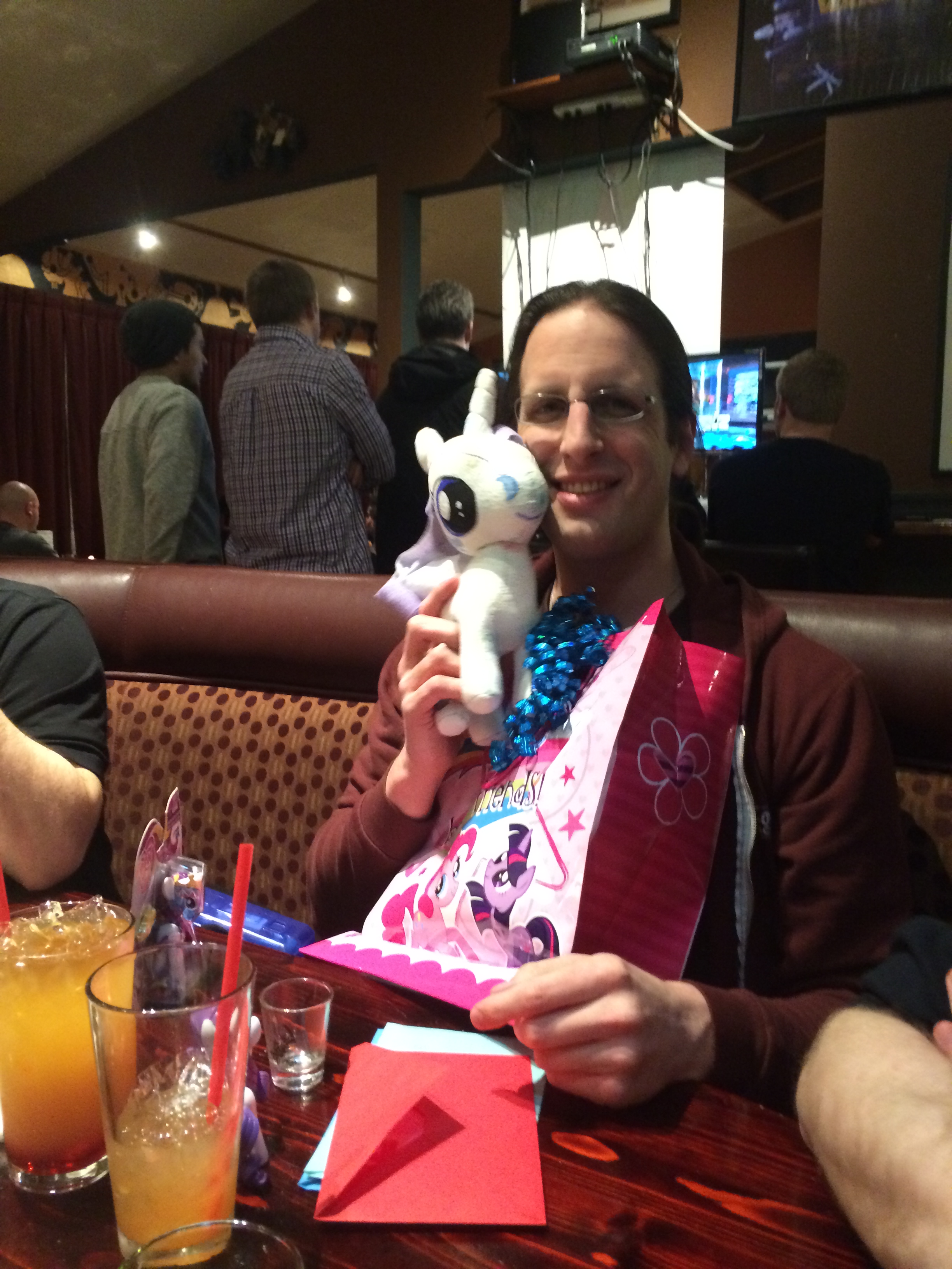 Jared with the cuddly, sleepy time Rarity filly doll (that squeaks!) from Joi’s shop.If you click to embiggen this one, you’ll see a couple of the other presents he got on the table in front of him: a shot glass with artwork by an artist Anthony introduced several of us to last summer, and a Crystal Empire Rarity toy.