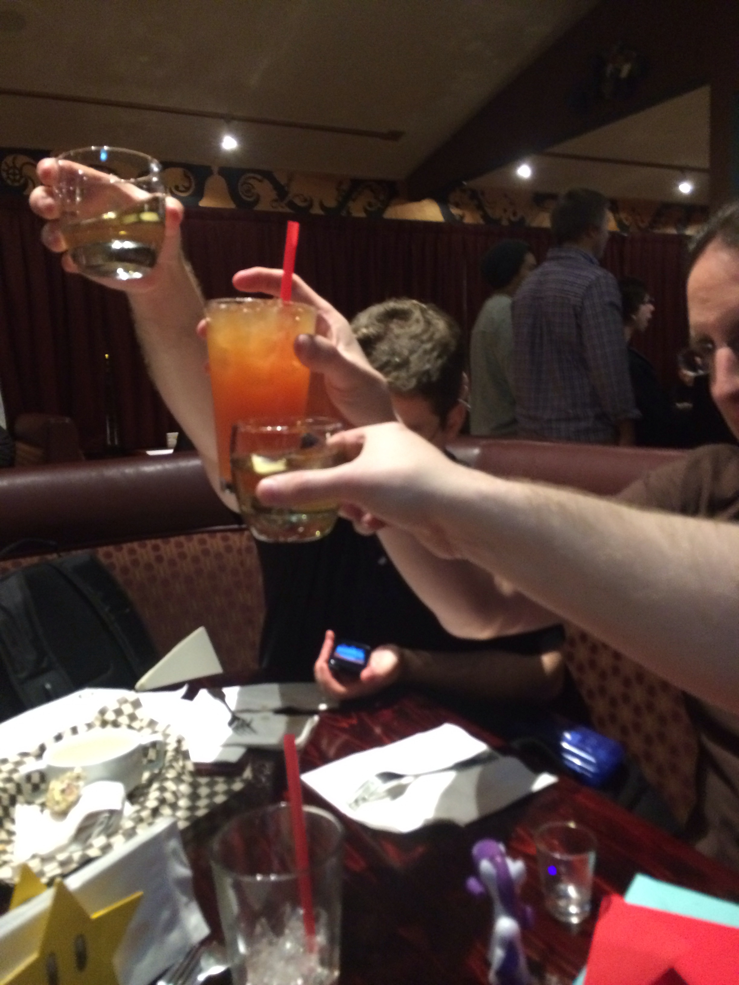 Yes, both of those cocktails in the picture are for the birthday boy.We didn’t quite drown him in Fluttershy Mai Tais, but I bought him one just as he arrived. Scottie bought him one next. Joi pinged me she could send me money to buy him one, so we did. I think he ordered one on his own. Except that J’wyl intercepted his check (and nearly intercepted mine!). We all had a lot of good food, and many Fluttershy Mai Tais (along with other cocktails) were consumed while we chatted, gossiped, and generally were a silly bunch.