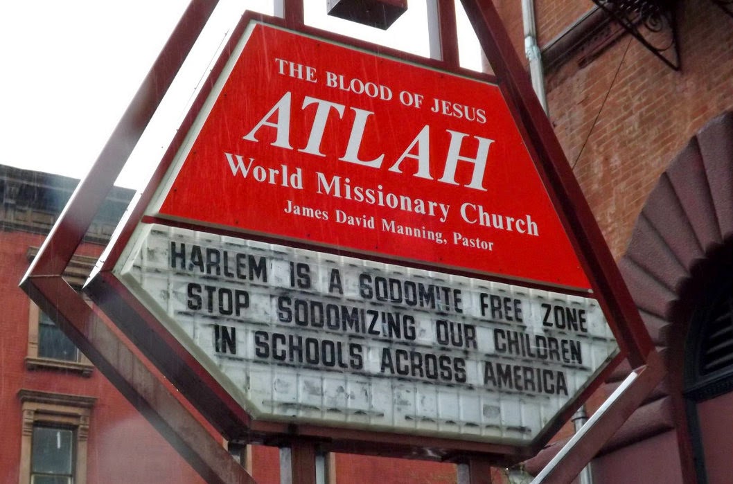And what horrors have been visiting on Pastor Manning’s church since his homophobic church sign messages have become news? A lot of news sites and bloggers made fun of them. A woman embarrassed a church employee by showing up to say she was there for her stoning. Someone vandalized the sign with spray paint.