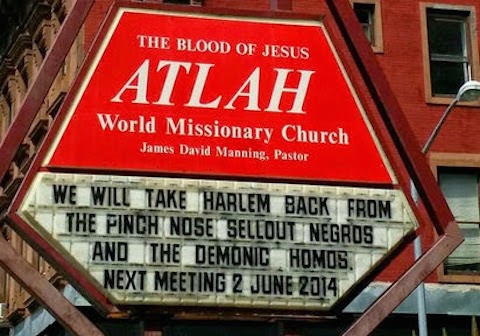 Manning and his church sign have featured in several of my previous posts, where he warned about white homo devils steal black men from good black women, where he proclaimed that Jesus would be stoning homos to death if he were here now, and so on. And people have argued that we should just ignore him, because he’s just crazy and the only people listening to him are crazy, et cetera.