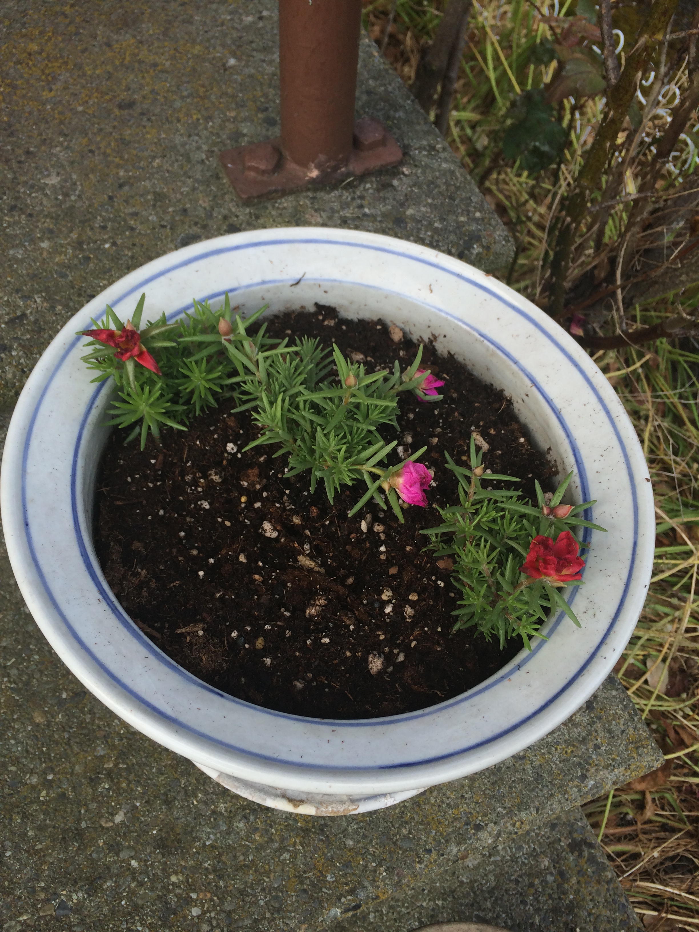 The potulacas grow fairly quickly, so in just a few weeks they ought to be covering all the dirt in the planter shown. They also bloom multiple times each season. I picked up enough starters to put one to three each in the nine planters we usually have on the steps.