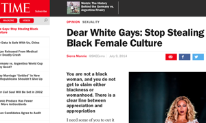 So Time allowed a college student to write an op-ed piece they published this week called, “Dear White Gays: Stop Stealing Black Female Culture.” A lot of other people have written some great responses to it (I most particularly recommend Vice Magazine columnist Dave Schilling’s answer in his This Week in Racism column), but I want to focus on something that most of them have overlooked. Among the offences Ms. Mannie lays at the feet of white gay men as proof that we are stealing the culture of black women: having sex with black men.