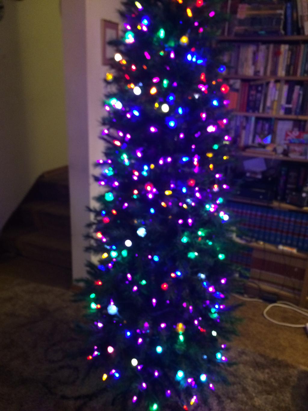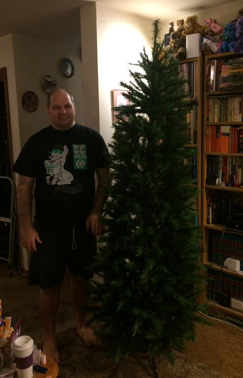 The tree assembled and ready to be decorated the brony (my husband) included for scale.As always, we spent a lot of time discussing the lights for the tree. Complicated by me trying to find the right boxes of lights from our existing collection. Which was itself complicated by two things: while our collection of lights is frighteningly huge, it is a lot smaller than it used to be. The last several years we’ve been tossing any of the older strings of lights that were showing signs of wear on the insulation and such. Then last year, when I found the place (through the city’s recycling web page) that you could ship your old light strings to in bulk, and they would melt down and recycle them, we decided to send many more of the older mini light strings away. All three of my old incandescent/mini light strings of chasing lights, for instance, had been bought before Michael and I started dating—in 1998. So, I put the white chasing string on the tree last year knowing it was the last time. But I didn’t quite remember that. I knew we had some twinkling white lights on the tree last year, so I wasted a lot of time digging through the boxes trying to find a string of twinkling LED lights, before we remembered about the old chasing lights’ last hurrah.