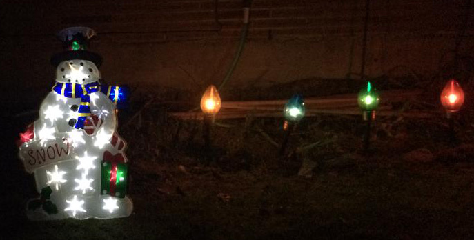 This taoist and his pagan husband blatantly display a mix of pagan and folk symbols during the sacred Christmas season.Once again, though the goal was to start decorating Thanksgiving weekend, the tree is only just now being set up. I did get a string of lights in the living room window, and one string of multi-colored icicle lights above the door, and a set of these big plastic lights across the front of one flower bed last weekend. So we’ve had some outdoor Christmas lights up all week.