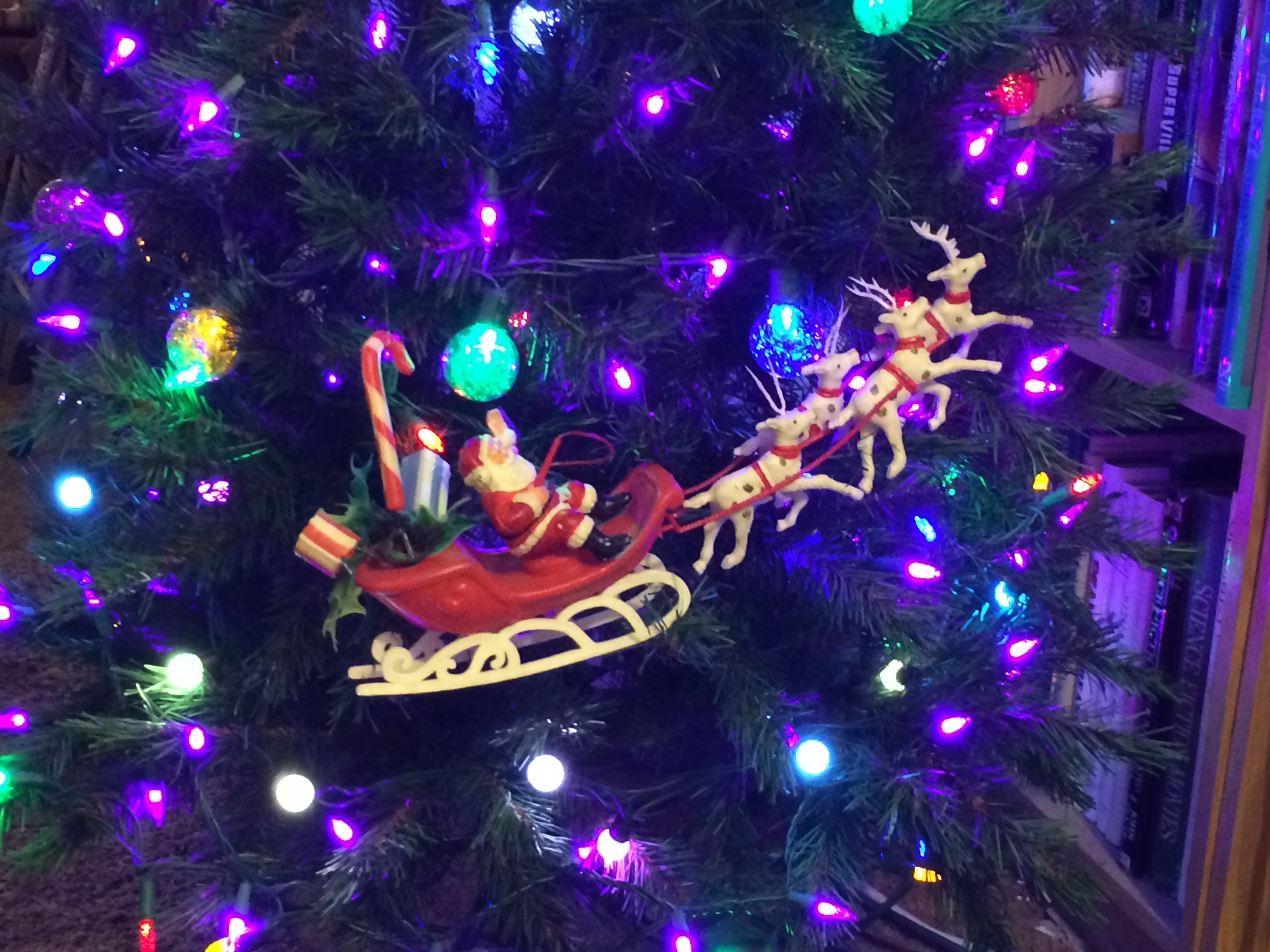 Great-grandma’s Santa is half of the cause of this year’s theme. The same year that my aunt gave me the Santa & sleigh, our friend, J’wyl, gave me a painted martini glass ornament. Along with the psychodelic colors, there’s text: “Coffee, chocolate, and men—the richer, the better!” The color scheme made me think of 60s/70s Las Vegas. There was a certain resonance between the Vegas feel of the glass and Great-grandma’s 50s/60s plastic Santa. So I started thinking about this decorating theme that would be very Rat Pack Vegas, a mix of glitter and retro and glitz and over-the-top lights, and so forth. It’s taken me three years to track down enough decorations to go along with that notion.