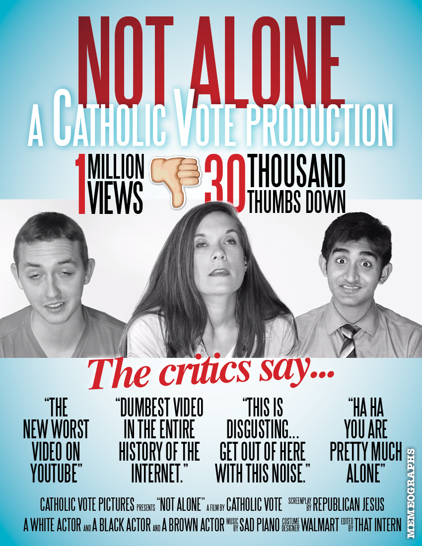 The auteurs at Catholic Vote have created an instant classic Christian cinematic masterpiece to rival Kirk Cameron’s Saving Christmas. Not since National Organization for Marriage’s “Gathering Storm” of 2008 have we seen delusional hyperbole, paranoia and self-pity lifted to such delirious heights. Like an episode of The Bachelor or a Lindsey Lohan court appearance, Not Alone is both terrifying and impossible to look away from. This important piece of filmmaking will surely inspire countless imitators, but Not Alone is so earnest in its own clueless, privileged insensitivity that parody may be superfluous (see Poe’s Law). Still, I look forward to seeing what influence this motion picture exerts on Stephen Colbert and the creative staff at The Daily Show, Funny or Die and Saturday Night Live.