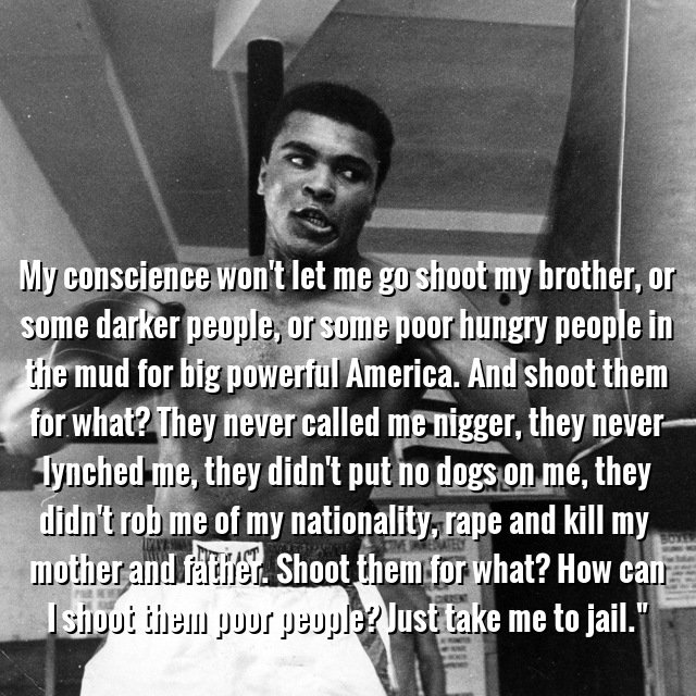 “My conscience won’t let me go shoot my brother, or some darker people, or some poor hungry people in the mud for big powerful America. And shoot them for what? They never called me nigger, they never lynched me, they didn’t put no dogs on me, they didn’t rob me of my nationality, rape and kill my mother and father… Shoot them for what? …How can I shoot them poor people, Just take me to jail.” One of Muhammed Ali's statements when asked why he refused the draft.