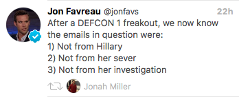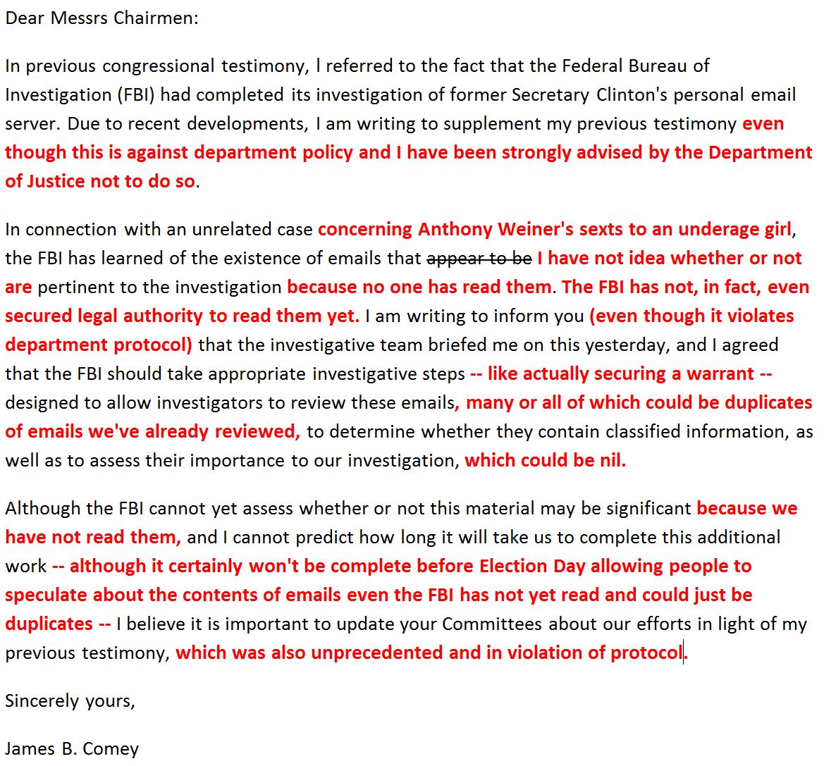 “The emails in question were, 1. Not from Hilary 2. Not from her server. 3. Not from her investigation.”Trump is facing multiple sexual assault allegations, with a trial on charges of child rape scheduled for December, and just this weekend he specifically urged his supporters to vote multiple times (in violation of law) after spending weeks claiming the system was rigged, and has urged his supporters to commit voter intimidation. But what is everyone talking about? A vague, misleading, and possibly illegal statement by the FBI director about emails supposedly related to the previous email investigate which found no evidence of illegal activity. Emails that no one has actually looked at. Emails that they haven’t even gotten a warrant to look at, yet. Emails that to the best of our knowledge aren’t from Hilary at all. It’s just that a computer owned by the husband of a staff member may have also been used by the staff member to access email accounts which might have been related to her past job on Hilary’s staff.