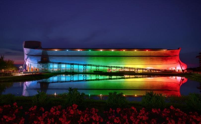 But then, remember, these same people decided two years ago to start lighting up the Ark with rainbow lights as an anti-gay statement. Again, I’m not kidding! They claim that they have taken the rainbow back from the queer community by lighting up this money pit like it’s a giant Pride Parade float: ‘Look at this gay boat’: Creationist’s use of ‘God’s rainbow’ colors for Ark park lighting gets hilariously mocked.