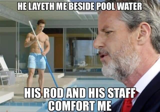 Falwell, Jr has tried to wiggle out of this scandal by throwing all the blame on his wife and claiming the Pool Boy was blackmailing him. Mrs Falwell has joined in, saying it was all her fault for being weak and sinning and bringing the Pool Boy into their lives. That doesn’t really Falwell sharing nudes and such of his wife with all sorts of people who didn’t want to see them, as well as the Pool Boy, Personal Trainer, and apparently several others. It doesn’t explain grooming college students as additional sex toys. It might possibly explain some of the multi-million dollar deals, but doesn’t really explain sending the jet for the Pool Boy again and again after the deal, nor enthusiastically introducing him to Trump (which we have not just photos, but Fox News video of).
