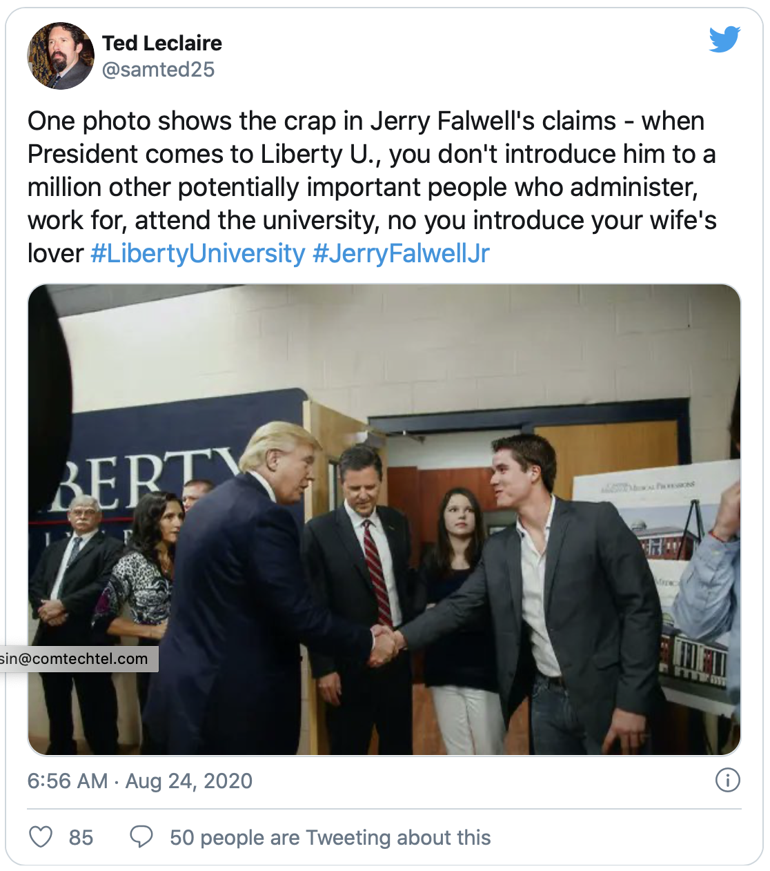 I already pointed out in yesterday’s post that Falwell’s claim that he wasn’t a willing participant in the sex going on between his wife and Giancarlo Granda is contradicted by Falwell’s actions during Donald Trumps visit to Liberty University in 2016. You don’t enthusiastically introduce your blackmailer to the candidate for President that you’ve just endorsed… I’m glad other people are pointing this out. I’m also glad people are pointing out that Falwell sent naughty pictures of his wife to Personal Trainer (the guy I have often called the Other Pool Boy)… and accidentally cc-ed a ton of staff members at the university. Again, not something one would do if they weren’t a willing participant in the sexual shenanigans.