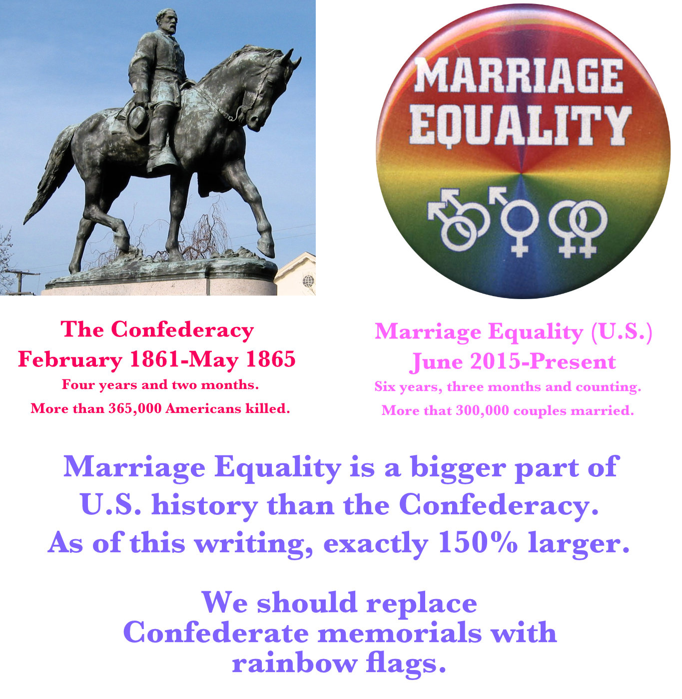 I was looking at various news sites and suddenly struck with the fact that as of this week, Marriage Equality, also known as Same-Sex Marriage had been the law of the land for 75 months, which was 50% longer than the total existence of the Confederate States of America, so all of those bigots who keep waving the Confederate flag are promoting something that has existed as at most two-thirds of the existence of Same-sex Marriage…