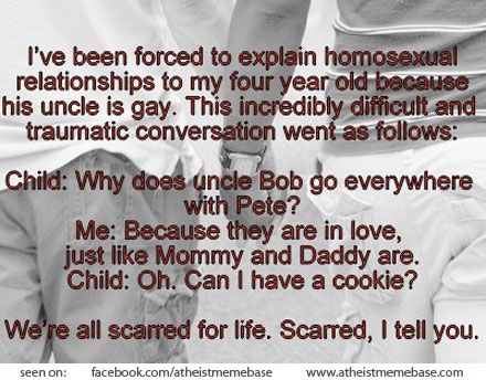 “I have been forced to explain homosexual relationships to my four year old because his uncle is gay. This incredibly difficult and traumatic conversation went as follows: Child: Why does Uncle Bob go everywhere with Pete? Me: Because they are in love, just like Mommy and Daddy. Child: Oh. Can I have a cookie? We’re all scarred for life. Scarred, I tell you.”I’ve been finding myself doing a lot of eye-rolling and teeth gnashing and biting my tongue lately over extremely asinine questions and assertions that cross my various information streams. Some of these are on social media, but a lot are also in news stories and/or coming out of the mouths of politicians, pundits, and so forth. When it happens on my social media, I sometimes decide to mute, block, or just unfollow the person. And when I mentioned that recently, someone asked didn’t I have a responsibility to educate people who unintentionally said bigoted things (or asked questions that are layered in all sorts of bigoted assumptions) so that they wouldn’t keep causing other people pain.
