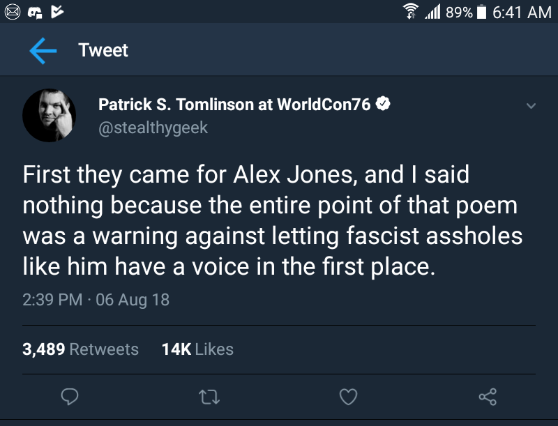 Anyway, now that Jones’ podcasts and such have been removed from the Apple podcast library, YouTube, Facebook, and Spotify, everyone on the right is in a tizzy that this is the first step in a coming progrom against all conservative people. And because I retweeted a few of the best responses to this nonsense I saw, I suddenly had a bunch of them trying to convince me that this was a clear example of censorship whose slippery slope would lead to the oppressing of queer people such as myself.