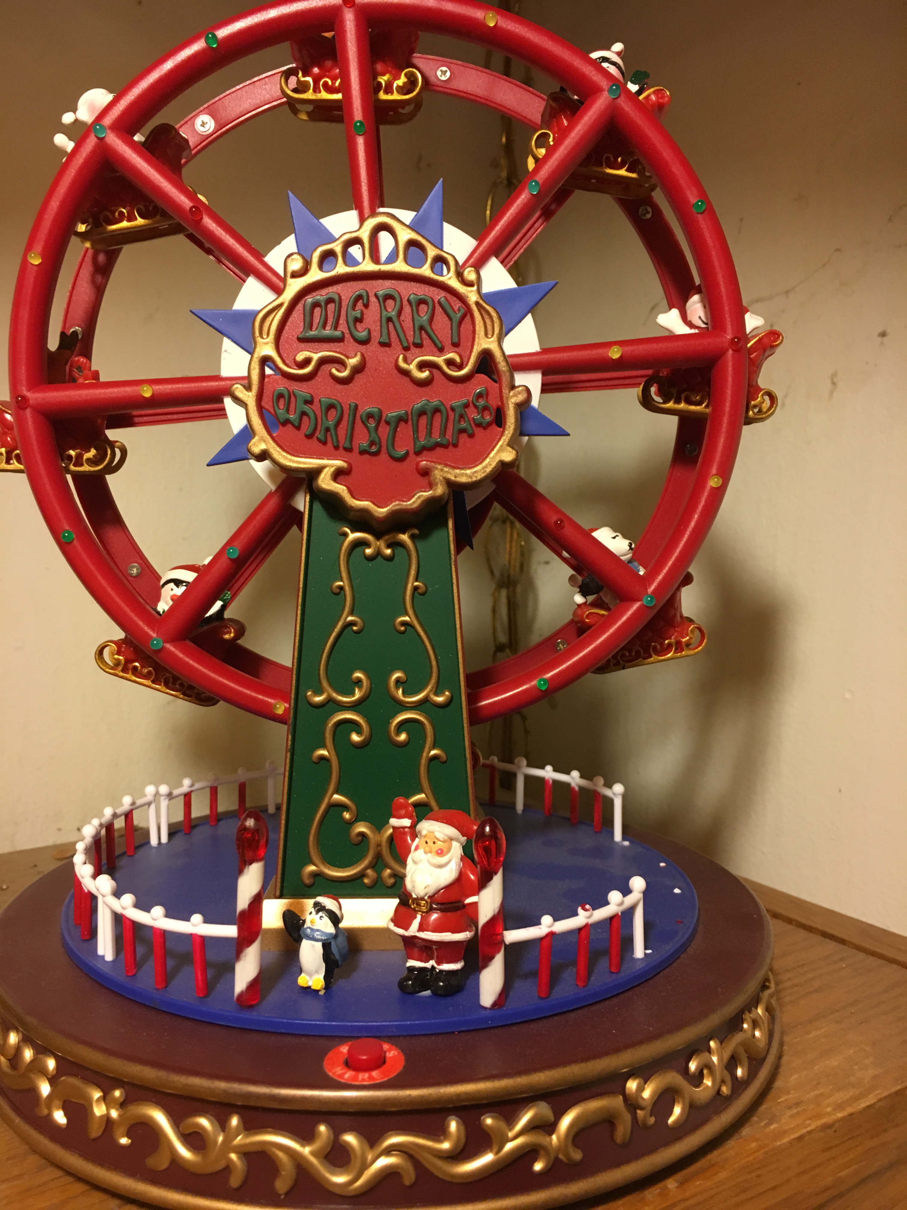 The plastic ferris wheel is battery powered, and it had two modes: it could light up and the wheel would turn slowly. The ferris cars rock on the wheel, and the wheel has always been a little bit jerky in its motion, so the little plastic snowmen and penguins and beers and reindeer seemed to be waving cheerfully as the wheel turn. In the other mode you got the lights, the rotating wheel, and you got tinny versions of Christmas carols. It was like a dream come true for me, and my husband’s worst Christmas nightmare all in one!