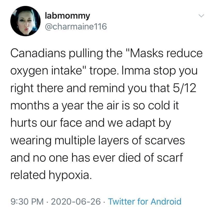 (Click to embiggen)And while I mostly point out the failings of my fellow Americans, it is important to remember that we don’t have a monopoly on either stupidity or ignorant conservatism. Wear a mask, and stop being a drama queen! Surgical teams wear masks far more restrictive than the simple cloth masks we’re asking for–and they complete hours long complicated surgeries with no one passing out, et cetera. Wearing a mask is different than not wearing one, but it isn’t onerous, it isn’t damaging to your health, and it isn’t something you can’t get used to. And it does save the lives of other people. Stop being ignorant, selfish pricks, and wear a mask!