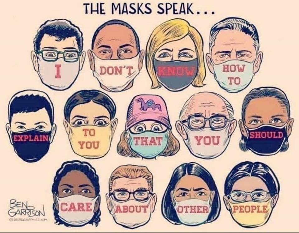 The masks speak…The vast majority of Americans are trying to be smart. We are trying to practice social distancing. We are wearing masks when we go out. The problem is a minority of stupid, evil, mother-fuckers. And I know that if too many of them get sick that puts health care workers at risk… but me thinking that politicians like this are only getting what the deserve is NOT what’s putting those workers at risk: Commissioner who Voted Against Masks in Critical Condition with COVID-19. If he dies, he had it coming. And I will not apologize for pointing out that fact. Speaking of people who had it coming: 26 lawmakers have tested positive for COVID-19 in Mississippi state legislature outbreak.
