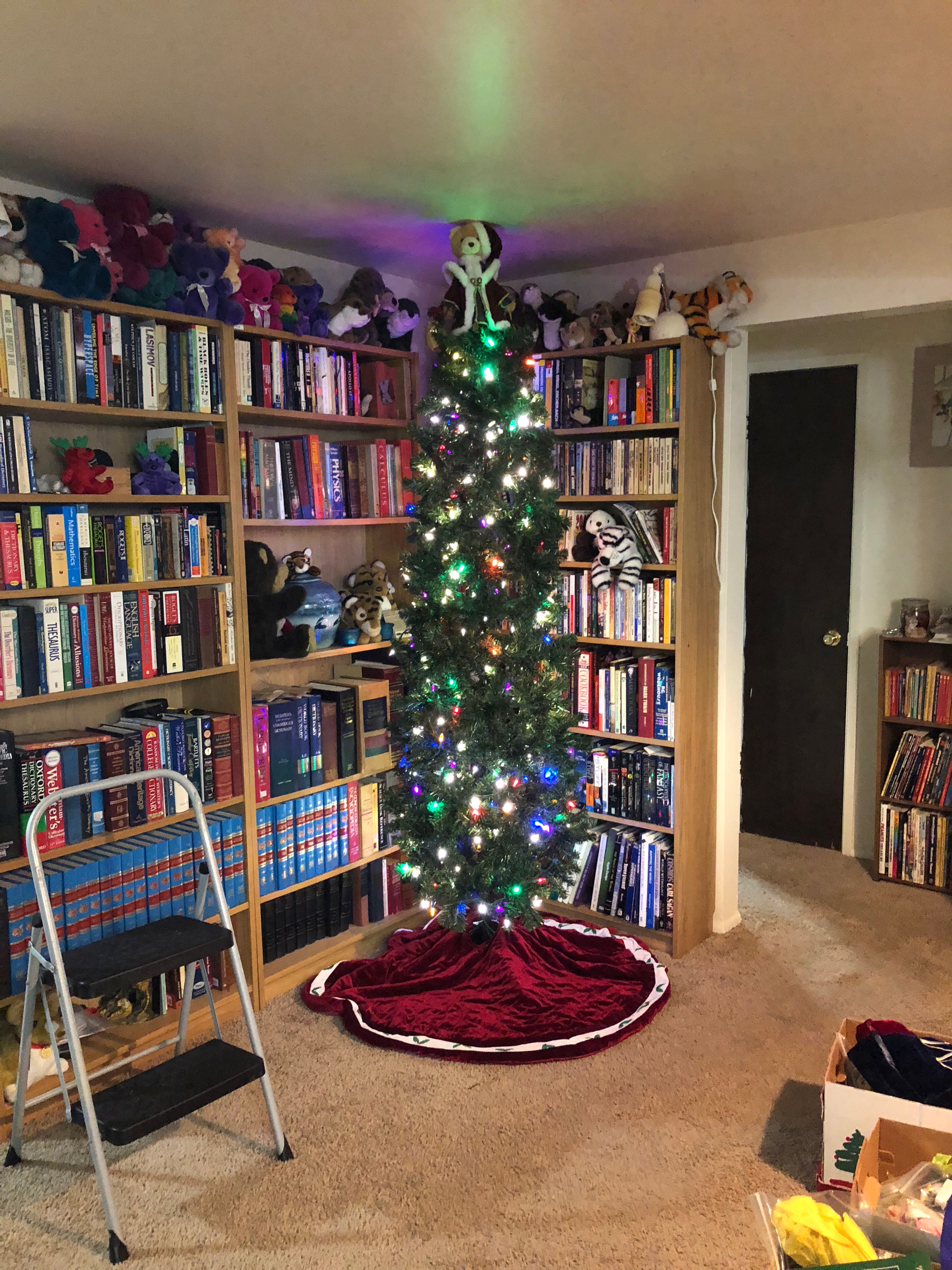 Anyway, the upshot is that for the rest of my childhood, Christmases were celebrated with that same artificial tree. The tree didn’t get retired until I was in my early twenties, after Mom remarried and moved to Arizona with her new husband, while I, still trying to save up money to transfer from community college to university, moved in with my paternal grandparents. As an adult, I’ve bought cut trees for Christmas twice, but otherwise have always had an artificial tree6. Back in 2000 or 2001 Michael and I bought a new 7-foot tall “pencil pine” tree. Unlike other trees we’d had, the body of the tree is very narrow, so it’s easy to fit into a small room, but still tall enough to create the big tree effect, and it holds a lot of ornaments. A couple years ago while we were setting it up, Michael pointed out how some of the branches had lost enough plastic needles to looks scraggly, and some branches were awfully loose. So we used it one more year, and then in an after Christmas sale we bought another, similar tree.
