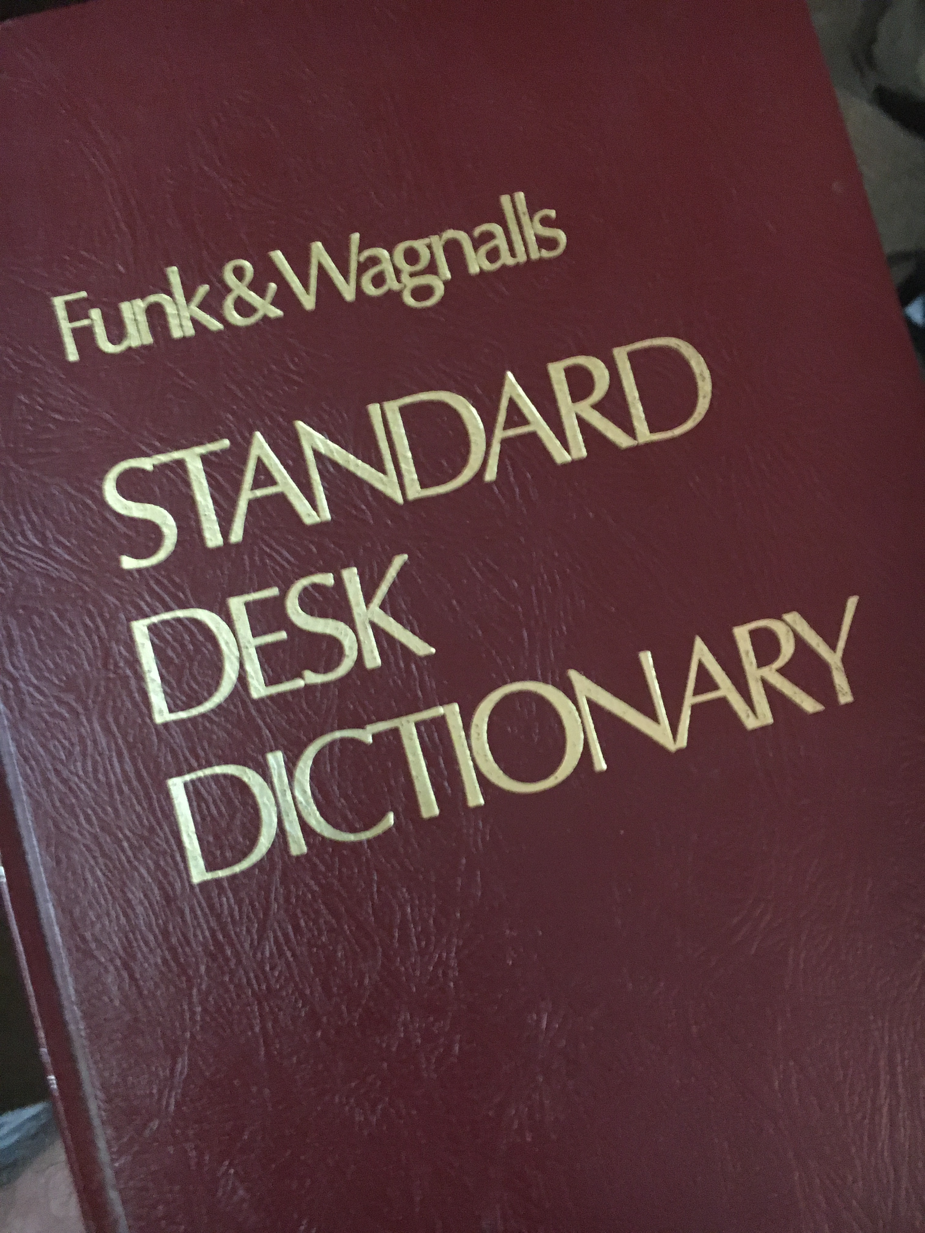 I was apparently so offended at the notion that I, as a second-grader, couldn’t understand a dictionary, that I ranted about it at Sunday School. Which eventually led the wife of the pastor at the church we were attending to give me a dictionary of my own. It was an old desk dictionary whose cover was held on by a lot of layers of black book tape, but it was mine. My parents didn’t have a dictionary in the house before then (though over the next few years we acquired a couple more).