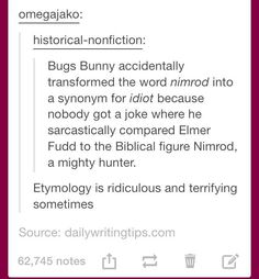 “Bugs Bunny accidentally transformed the word nimrod into a synonym for idiot because nobody got a joke where he sarcastically compared Elmer Fudd to the Biblical figure Nimrod, a mighty hunter.” “Etymology is ridiculous and terrifying sometimes.”I remember very clearly watching an old Bugs Bunny cartoon on TV when I was a kid and Bugs Bunny referred to Elmer Fudd very disparagingly as a Nimrod. And I didn’t know what it meant. At that time, my family didn’t yet own either an encyclopedia set nor a dictionary, which means it was before 1970. So when I asked Mom what it meant, she wasn’t sure. So I had to wait until I could go to the school library and look it up in the dictionary where it was defined as “noun, 1 Grandson of Ham, described in Genesis as a mighty hunter 2 a hunter.” Which didn’t seem very insulting, and clearly Bugs meant it as an insult, right? It took me several minutes of thinking about it before I realized that Bugs Bunny was being sarcastic. It was describing someone who he thought was an incompetent hunter by alluding to a Biblical figure who had been a good hunter.