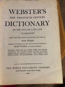 Now the sad part is that we were doing this specifically because we’re both working on hall costumes for NorWesCon (at the end of March). My husband actually found things for one of his costumes, but what did I find? Well, I found a copy of the 1951 edition of the World Publishing Company’s New Twentieth Century Webster’s Dictionary of the English Language Unabridged. Yes, that whole thing was the official title. This was one of the dictionaries produced after the legal ruling that found the Merriam-Webster Company could not prevent other companies from using Noah Webster’s name on their dictionaries even though they weren’t actually using Webster’s original dictionaries nor operating under the auspices of the agreement made between Mr. Webster’s estate and George and Charles Merriam back in 1843.