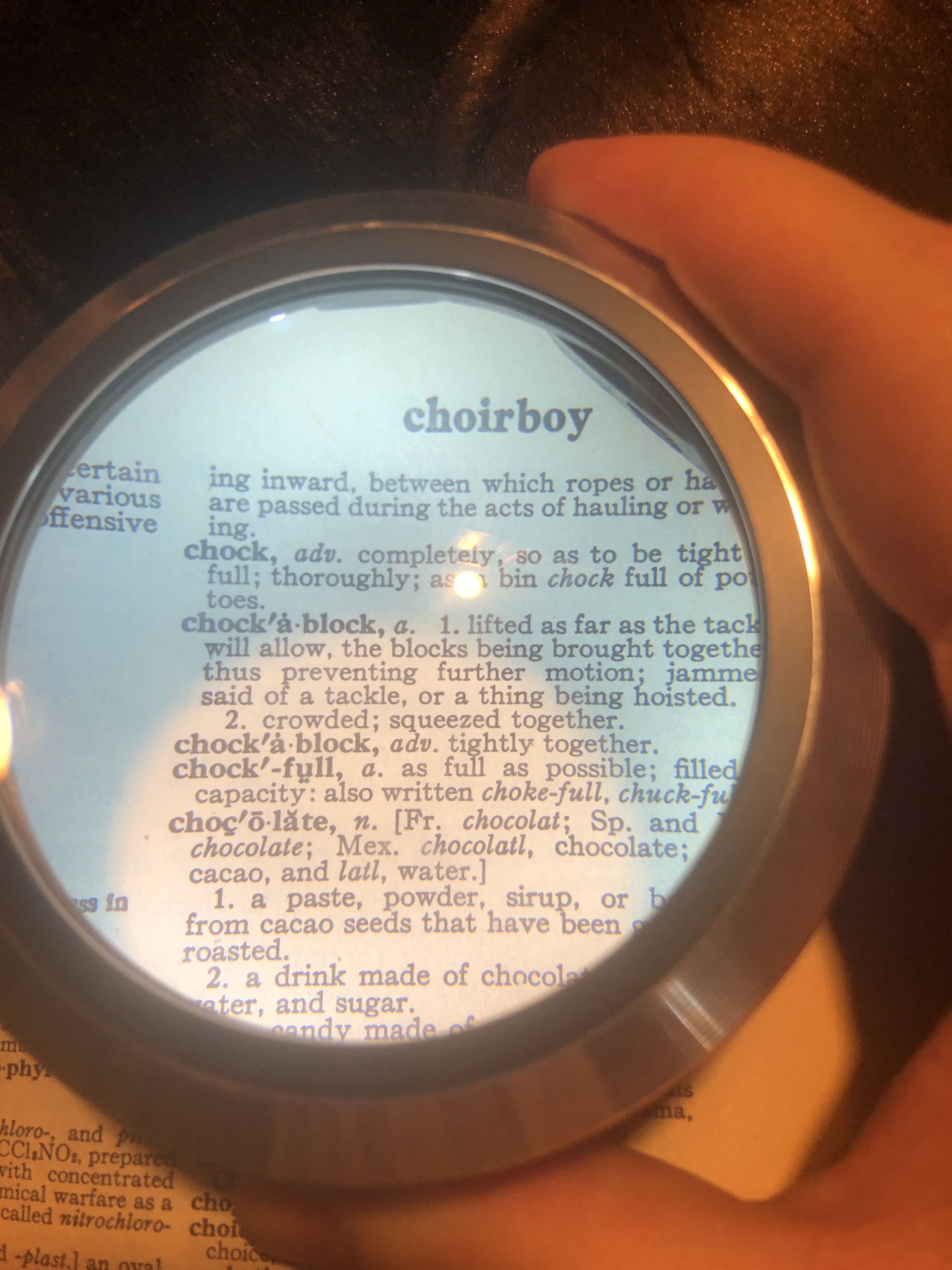 Using my self-lighting magnifier with my latest dictionary acquisition, (Click to embiggen)If you’ve ever known a collector of anything one thing you learn is the collector seldom has a concept of the word “enough.” No matter how many trading cards or figurines or fossils or whatever it is the collector fancies they already own, if they find one that they don’t already have in good condition at a reasonable price, they’re all over it. And my penchant for collecting dictionaries is no exception. While other people were watching the Super Bowl last Sunday, my husband and I were hitting a few thrift stores. And guess what I found?