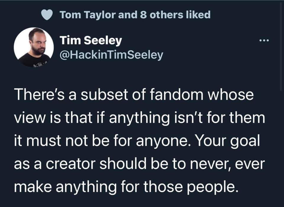 I am not pointing at people who are clamoring to get into the Sandman fandom and saying that they aren’t welcome. I am pointing to people who are screaming about how much they hate The Sandman and insisting that anyone who does like this thing they don’t like is the wrong kind of fan. Which is a different thing all together.