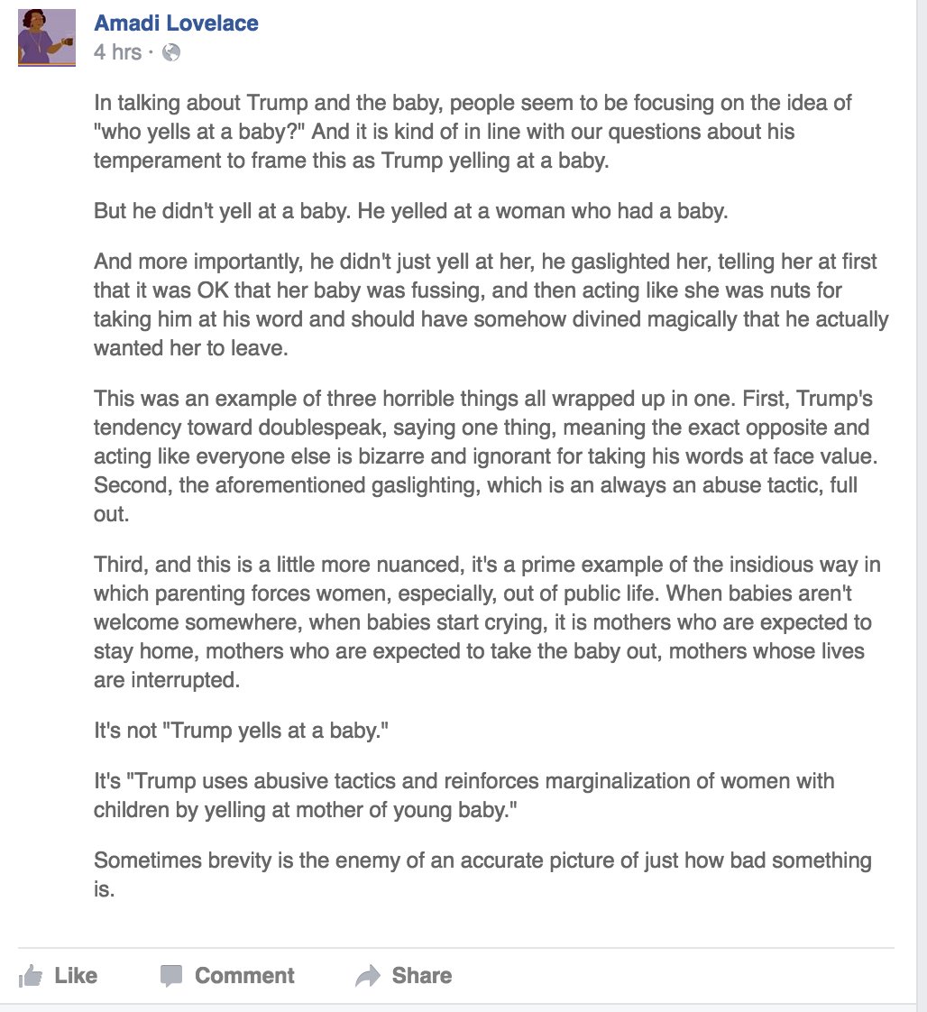 As Amadi Lovelace sums it up in the screenshot: “Trump uses abusive tactics and reinforces marginalization of women with children by yelling at mother with baby.”