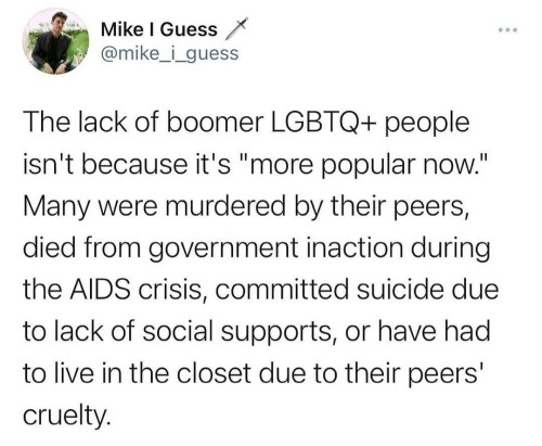 “The lack of boomer LGBTQ+ people isn’t because it’s ‘more popular now.’ Many were murdered by they peers, died from government inaction during the AIDS crisis, committed suicide due to lack of social supports, or have had to live in the closet due to their peers’ cruelty.”