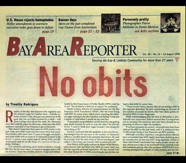 The August 13, 1998 edition of the Bay Area Report was the first edition in over a decade that didn’t have obituaries of local residents who had died of complications of AIDS.