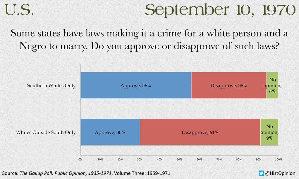 A friend shared the graphic I’ve included above from @HistOpinion on twitter recently, and I was most amused by the people who were shocked to learn two things: as recently as 1970 there were still several states with laws against interracial marriage, and as recently as 1970 a lot of people approved of those laws.