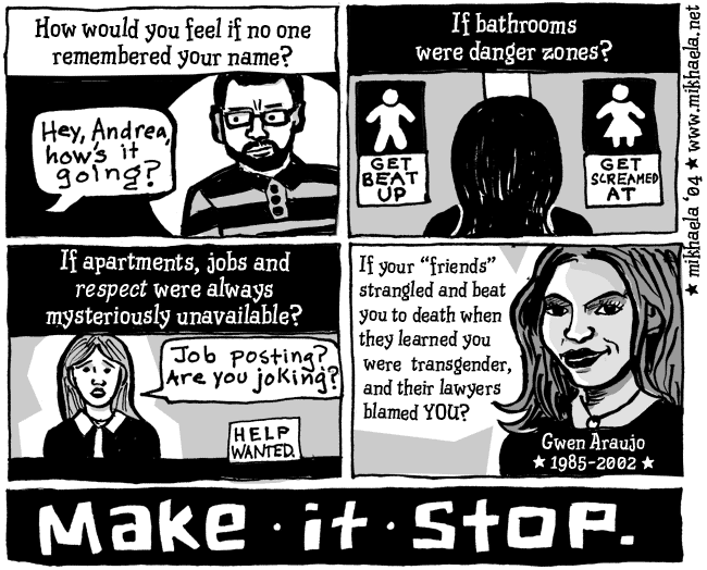 Before arguing that transgender protection is hardly the same thing as murder, you might want to google Transgender Day of Remembrance and read some stories of things that have happened to real trans people. Furthermore, things like the “safe schools for trans kids” policies mention restrooms and locker rooms precisely because it is around this issue more than anything else that harassment, bullying, and assault take place in schools. The policy is about allowing these kids to use the appropriate facilities without facing all of that. Yes, that means educating some kids that it isn’t acceptable to harass, tease, bully, or assault their trans classmates, but why would a just society allow one group of kids to harass, tease, bully, or assault another, period?