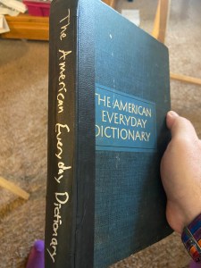 Many, many years later, Mom mentioned that the dictionary she’d bought herself was the only one she owned, so for her next birthday I bought her a much more comprehensive Merriam-Webster dictionary. Some time after that, when we were visiting for a holiday or something, Mom brought out the old dictionary and said she never used it anymore because the newer one was much nicer. She was thinking of getting rid of the old one, but before she did, she wanted to offer it to me. Of course I took it.