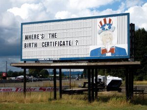 Because of course he’s also a birther…In the mid-nineties Hamilton sold his farm to a large agro-business and prepared to retire to Alaska. The sign was deconstructed again, and people living nearby thought it was finally going away. But, nope, the billboard went back up nearby. Hamilton’s son still owned some adjacent land where he was running some sort of RV business, and he put the sign up, there. Still quite visible from the freeway. Apparently the messages stopped getting changed out weekly for a number of years. According to one of the articles I found while I was looking for representative pictures, Hamilton was still composing the messages up in Alaska and sending them to his son until his death in 2004. Now the son is carrying on the hateful tradition on his own.