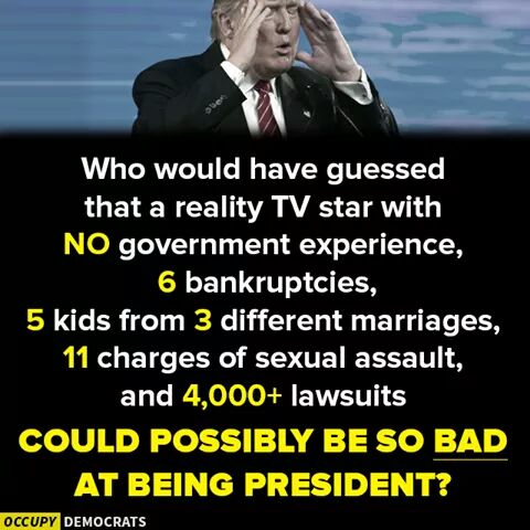“Who would ahve guessed that a reality TV star with NO government experience, 6 bankruptices, 5 kids from 3 different marriages, 11 charges of sexual assault, and 4,000+ lawsuits could Possiblby Be So BAD at Being President?”