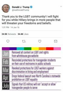 And this isn’t even every anti-gay thing Donald did during the first seven months of his presidency. (Click to embiggen)It’s a false equivalency, in any case. Let’s look for a moment at the transgender bothroom bills as an example. The bigots who push the bills make a lot of noise about sexual assault (despite the fact that many states have had laws allowing transgender people to use the bathroom the matches their gender identity and there as never been a single case of someone using the law to try to commit assault), or the religious freedom argument. But all of that is just smoke and mirrors. Look at the actual impact of the laws banning transgender people from using a public bathroom that matches their identity. The practical upshot is that under such laws, transgender people cannot safely use any public bathroom. At all. If they try to go into the bathroom that matches their gender presentation, they are violating the law and risk arrest. If they try to go into the bathroom that matches their gender assigned at birth, particularly if they don’t look like they belong there, they risk being harassed, beaten, and worse. The effect of the law is to make it impossible for transgender people to exist in public places, work places, and so forth. And that isn’t an unintended consequence. The people pushing the laws don’t think transgender people have a right to exist at all.