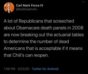 Meanwhile, some people aren’t just being idiots, they are being evil: Landlords Sexually Harassing Tenants And Renters Aid Coronavirus Pandemic – “He knows I don’t have a job. He knows I don’t have anywhere to go — he’s preying on me.”.