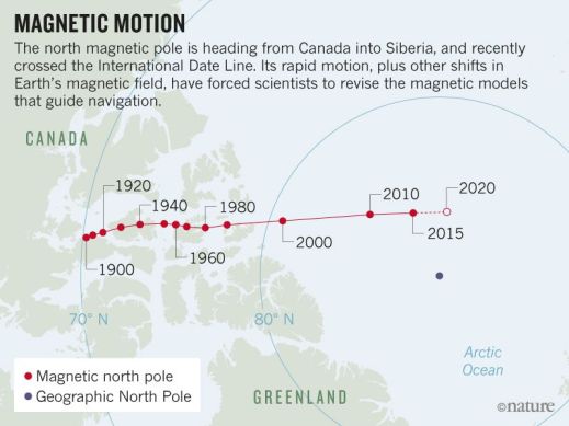 This would have gone in the science links on Friday if I had been able to find an article whose headline didn’t have misleading things in it. I know, I should have just written my own. Anyway, so the magnetic field of the planet always fluctuates and wiggles around a bit, and back in the day when a compass was always an object at least big enough to fill the palm of your hand, the amount of drift didn’t matter. But modern navigation devices (and the way we use them) require a bit more precision, so scientists map the field changes and try to build mathematical models that allow the computerized navigation aids to take the changes in the field into account. Well, things have been a bit more dicey than usual the last few years: Erratic motion of north magnetic pole forces experts to update model that aids global navigation.