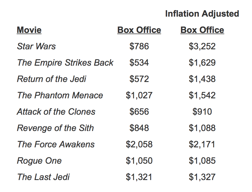 Please note: when adjusted for inflation, the original Star Wars made three-and-a-quarter billion dollars at the box office—that’s $3,252,000,000! Notice, also, the big drop-off that The Empire Strikes Back suffered, and then how the number went down a bit more for the third movie, The Return of the Jedi.