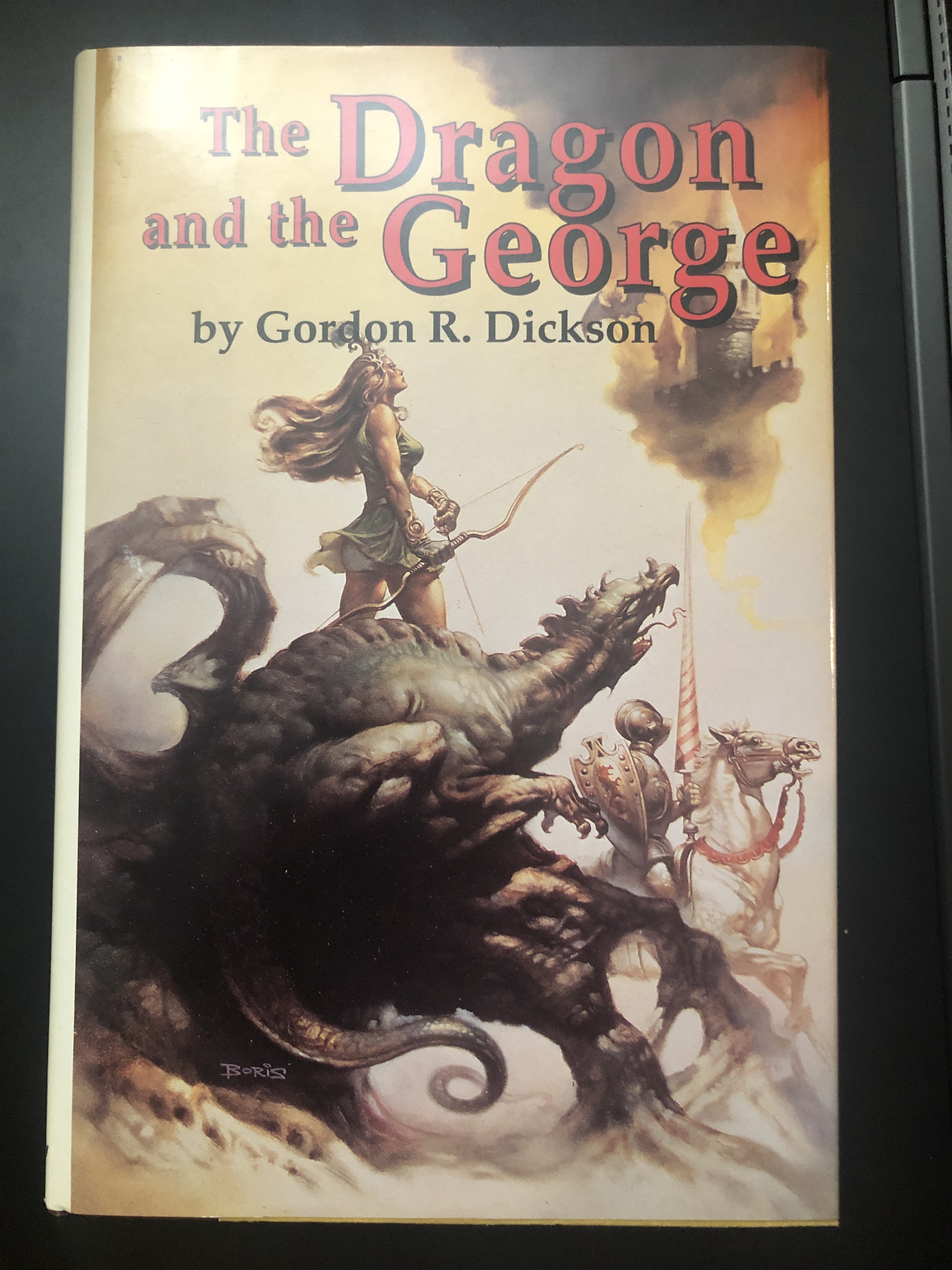 My copy of The Dragon and the George, which I never realized was a fist edition until I was researching for this blog post.I’ve mentioned before that I joined the Science Fiction Book Club when I was in middle school. Now, the problem was that I didn’t have a steady source of income, and I did my first order without consulting any adults in my life1, and so I had not realized that the cheap price on the advertisement did not include shipping, so this mysterious box arrived in the mail with postage due and my parents were not pleased. Anyway, for the next several years I had to remember to send the post cards back in saying “Do not send this month’s selection!” except on those occasions that I had some money or that my parents agreed I could have the particular book and they would pay for it. Anyway, from about October 1975 until July 1976 I got to order one book every month because my parents were going through a messy divorce and my paternal grandfather declared he would pay for the books4. And one of the books I got during that interval was The Dragon and the George by Gordon R. Dickson.