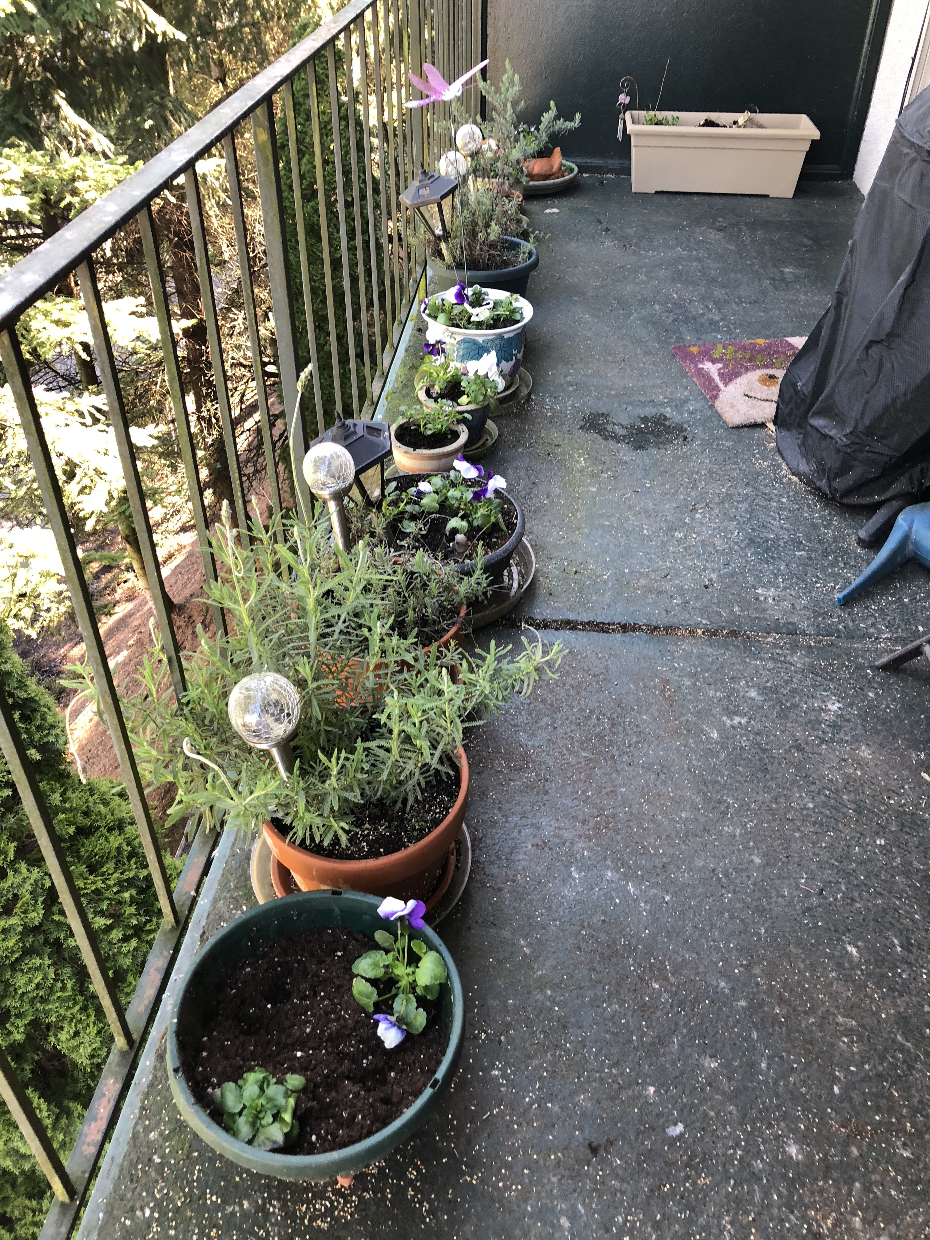 One of the things I accomplished this weekend was getting the veranda ready for spring. Which meant planting new flowers in my planters. And that meant a lot of cleaning, repotting, pouring off excess water, dumping of old potting soil and the dead remnants of last fall’s final flowers. My various lavender plants were already budding, so it is arguable that I should have started working on the other pots earlier. On the other hand, it was only a couple of weeks ago that overnight low temperatures were in the 20s, so this sudden temporary spring was a great opportunity to get things started out there.