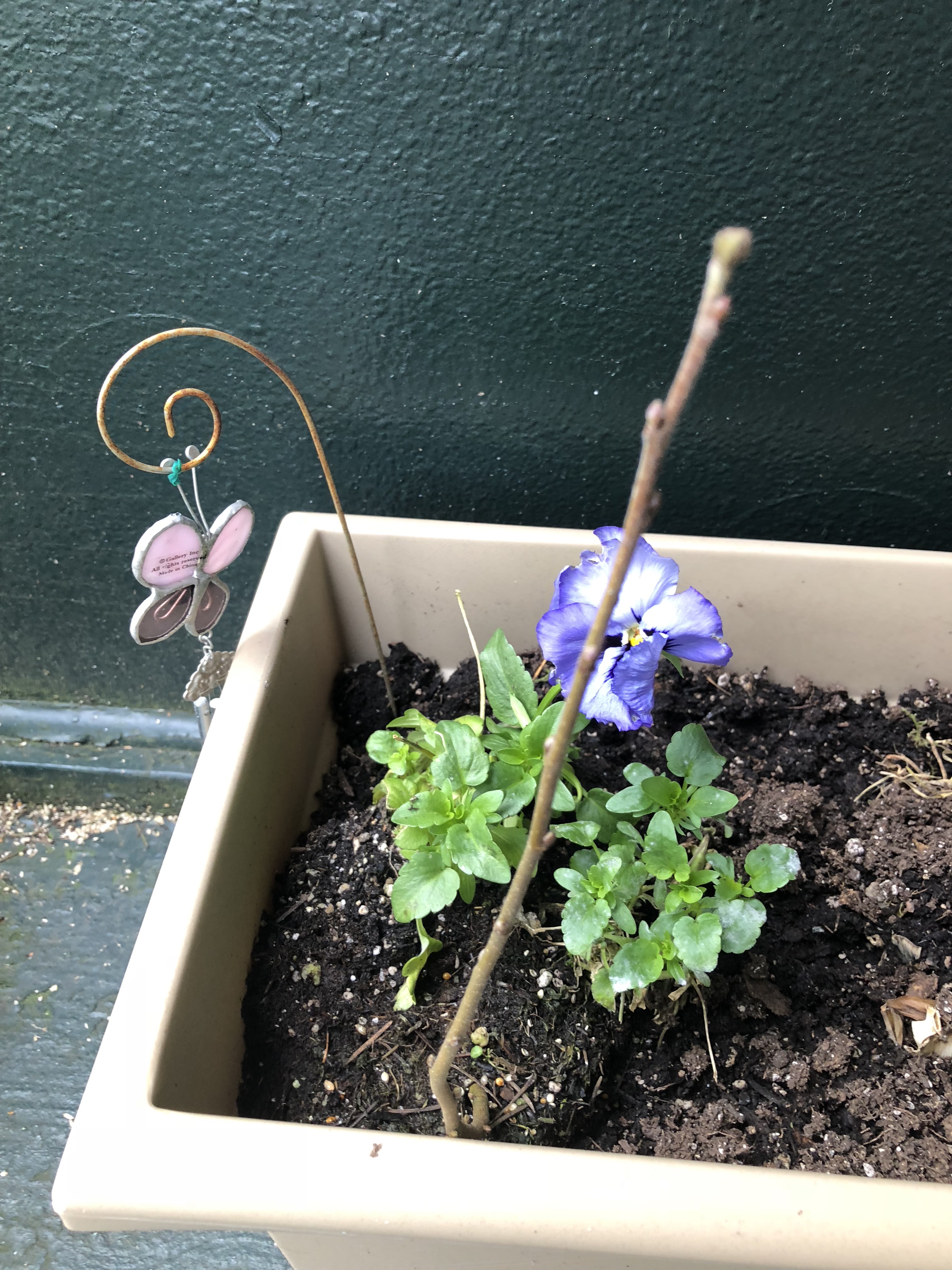 Since I was moving the entire pot, there was no point in pulling the two pansies loose. So they moved to the bigger planter along with the tree. It has been 9 days, and not only are they both much leafier and much greener than they were when I transplanted them, one has bloomed again! Which I’m going to take as a sign that the squirrel god is happy that I am trying to keep the tree alive. I know in the picture that the tree just looks like a stick, but just a few weeks ago it was a drab brown stick, whereas now there is clearly a lot of green in that bark. Plus there are a bunch of little buds all up and down the tree. So I expect it to be much leafier this summer.