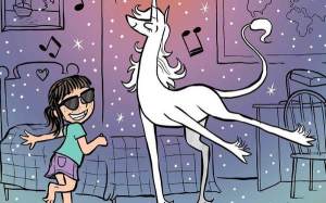 Phoebe and Her Unicorn by Dana Simpson concerns the adventures of 9-year-old Phoebe Howell. One day, Phoebe skipped a rock across a pond, and the skipping rock hit a unicorn named Marigold Heavenly Nostrils in the face. This happened to free the unicorn from her own reflection, so she granted Phoebe one wish. Phoebe wisely wished that Marigold would become her best friend. If you like the comic, you can buy the books here and enamel pins and other stuff here.