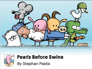 Pearls Before Swine by Stephan PastisThe heart of the series are two characters, a clueless Pig and an arrogant Rat, and they comment on just about everything. It’s hard to describe that subject matter beyond “human foibles and society.” The author says his goal is to poke fun at humans’ unending quest for the unobtainable.