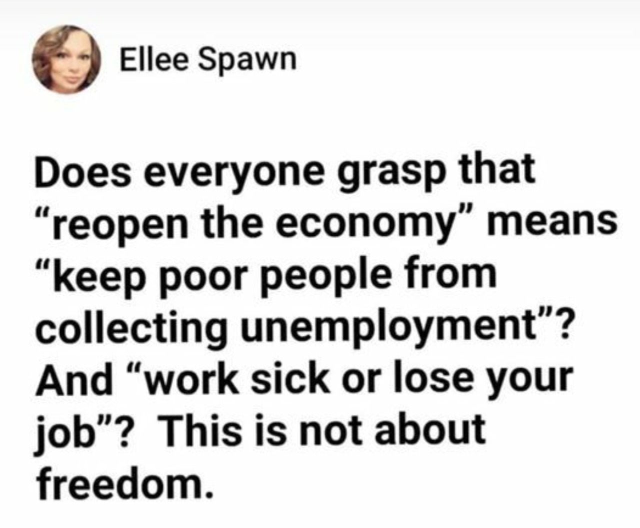And saying, “People who are afraid of getting infected can just stay home. The rest of us want to be able to go to a restaurant or get our hair cut.” Just proves that you don’t think service industry workers are people. Because if there isn’t a shut down and there isn’t unemployment to cover them, then they have no choice but to risk their lives and the lives of their loved ones just so you can have your dang hot wings.