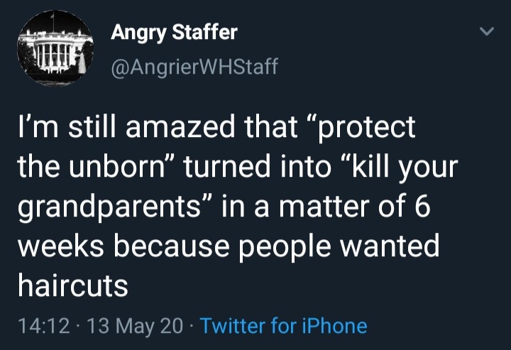 We saw this coming. Covidiot New York Barber Cutting Hair ‘illicitly’ During Lockdown Tests Positive For COVID . Now, I want to make it clear, I don’t think this is ‘just desserts’, and I’m not cheering the fact that this guy has gotten this disease which is far, far worse than the flu. (See the story I linked to yesterday of the body builder who spent 6 weeks on a ventilator if you don’t understand). There are multiple tragedies here: 1) the guy is an idiot, yes, but his idiocy has been caused, enabled, and cheered on by a bunch of people in the rightwing media and politics who are themselves taking the very precautions they are urging others to protest, 2) if he tested positive, that means a number of his customers during this time who came in for the illicit haircuts got infected while there.